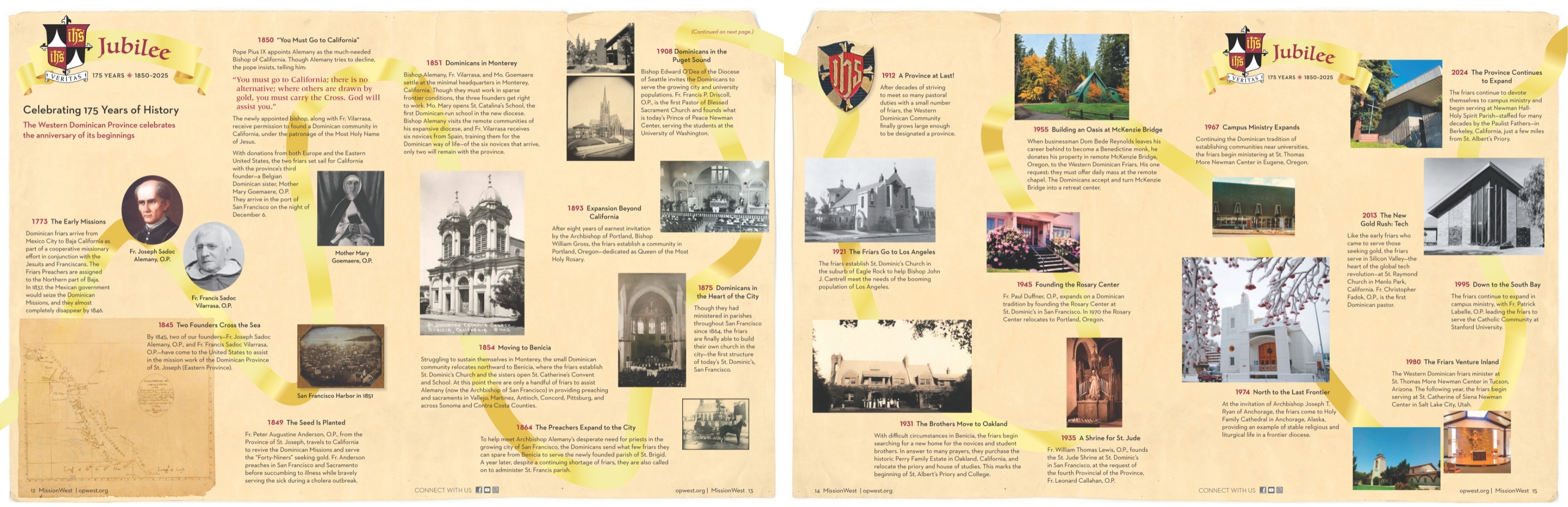 As we celebrate the 175th anniversary of the Province's beginnings, we reflect on how the Dominican Friars have carried on the mission to save souls, even after the rush for physical gold came to a close. The American West has continued to grow, drawing all peoples of the earth to its naturally and culturally beautiful landscape. For 175 years, the Friars Preachers of the Province of the Most Holy Name of Jesus have continued to reach out to all those seeking fame and fortune, or simply a new life.